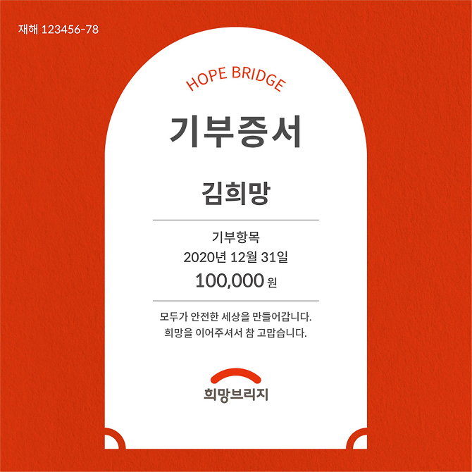 - 기부증서는 희망브리지가 발급하는 공식문서로 변형 및 도용을 금하며 허위 제작 시 법적 처벌을 받을 수 있습니다.